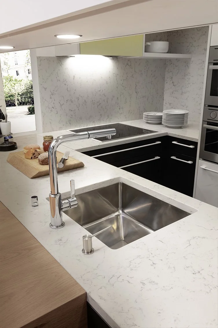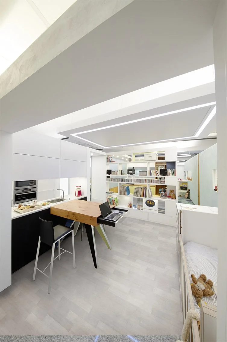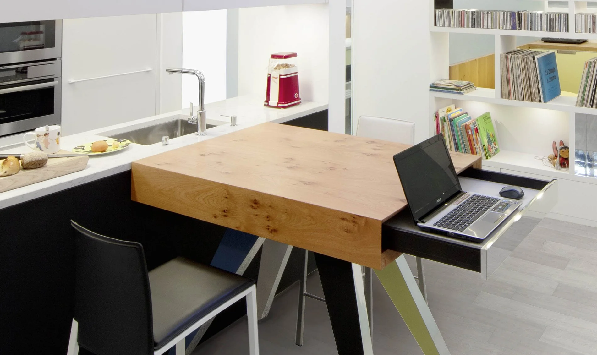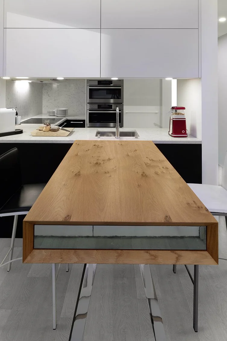 La soluzione progettuale che personalizza il piccolo spazio è l’apertura sulla zona pranzo, con il piano del tavolo allo stesso livello del piano di lavoro della cucina. Questo sistema permette alla luce di penetrare dalla finestra principale in cucina.