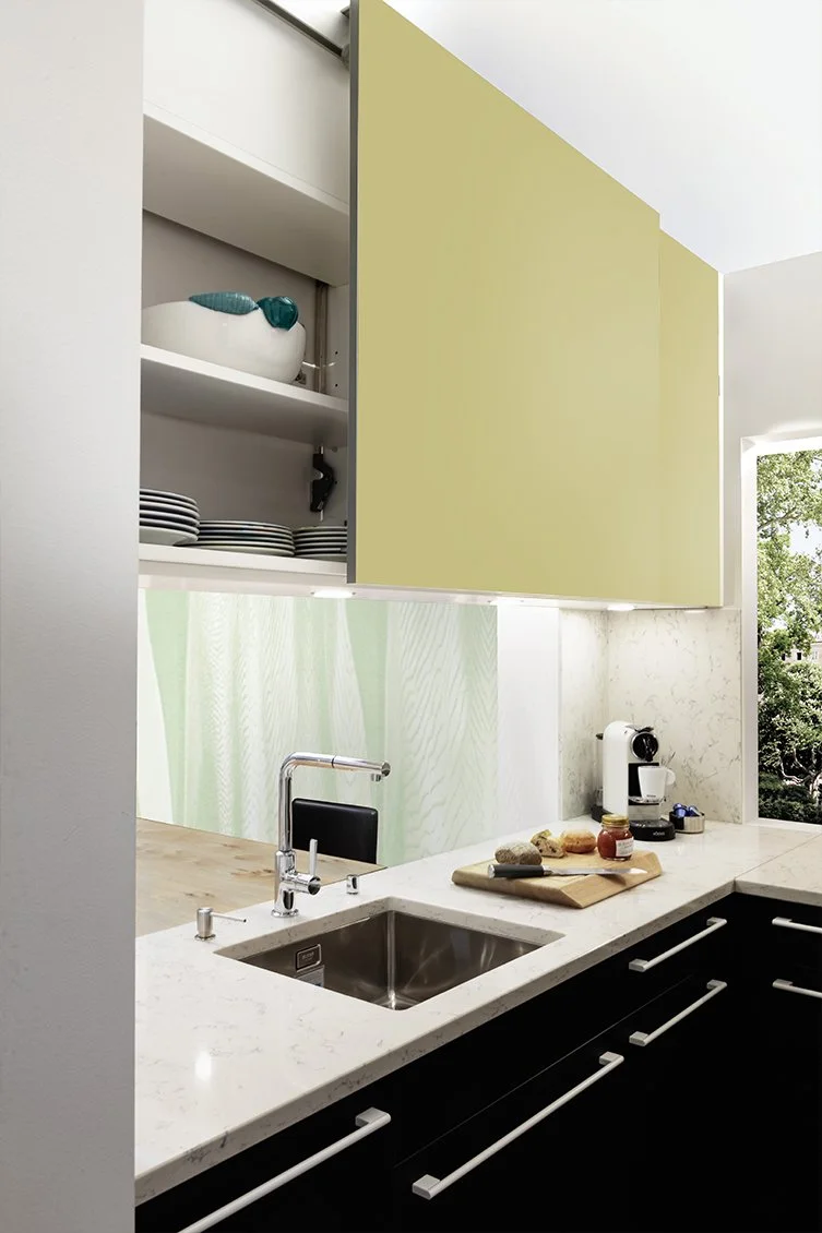 I pensili sono dotati di ante complanari da un lato e a ribalta dall’altro, nelle basi angolari sono stati inseriti ripiani estraibili con meccanismo “LeMans” per avere completa visibilità del contenuto. Le colonne contengono i forni, il frigorifero e un Magic Corner per le provviste.