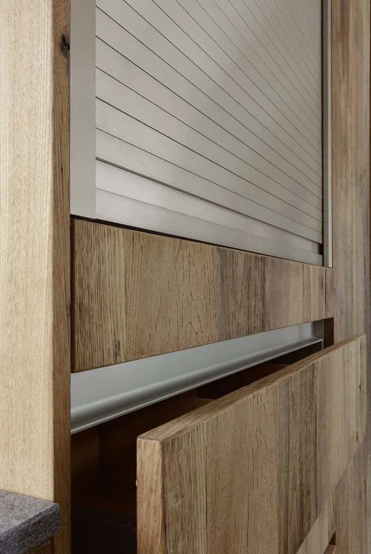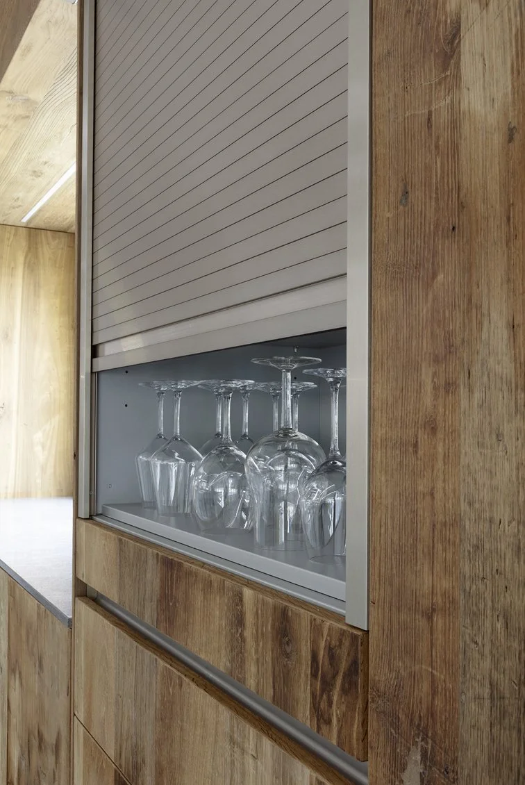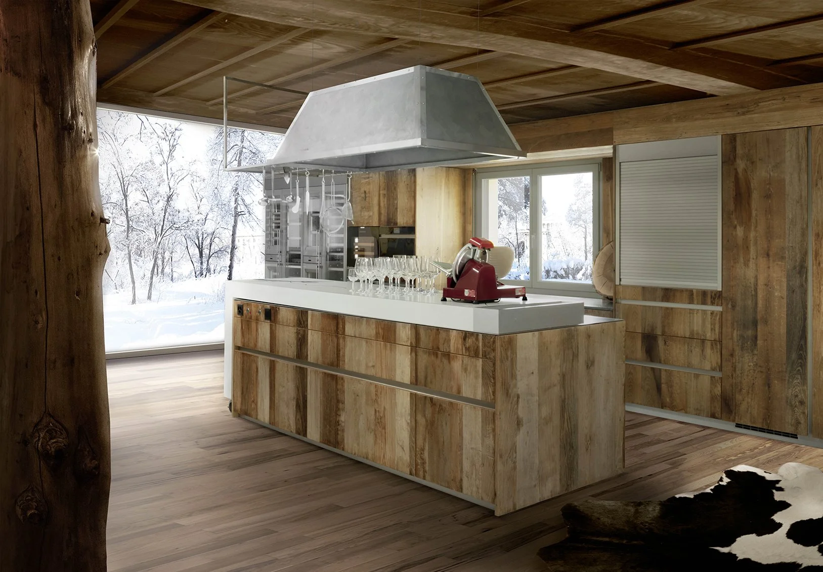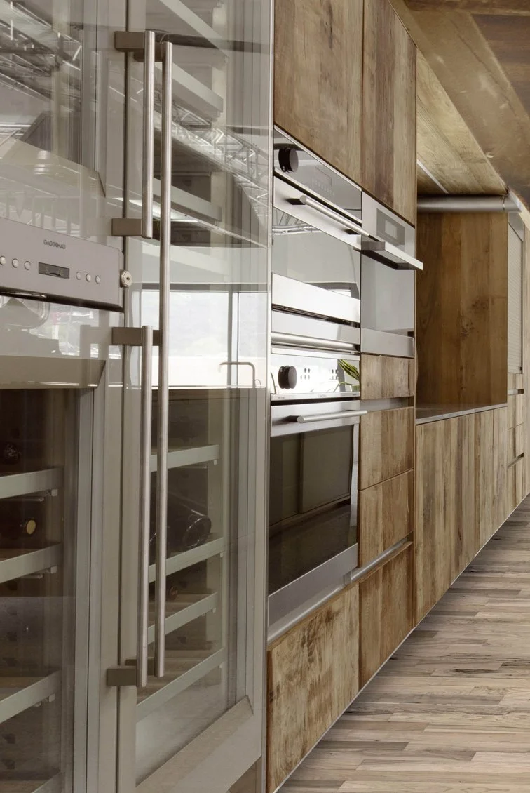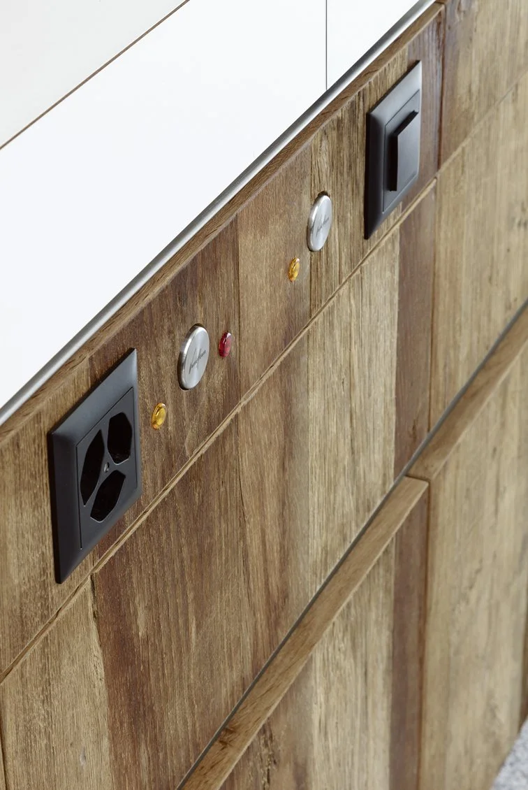 Le bois massif donne à cette cuisine une irrésistible aura de naturel qui fait penser à un espace vierge constitué exclusivement d’éléments naturels. L’agencement moderne des zones fonctionnelles de la cuisine s’harmonise à merveille avec l’ambiance accueillante et le cadre ancien qui rappelle le siècle dernier.