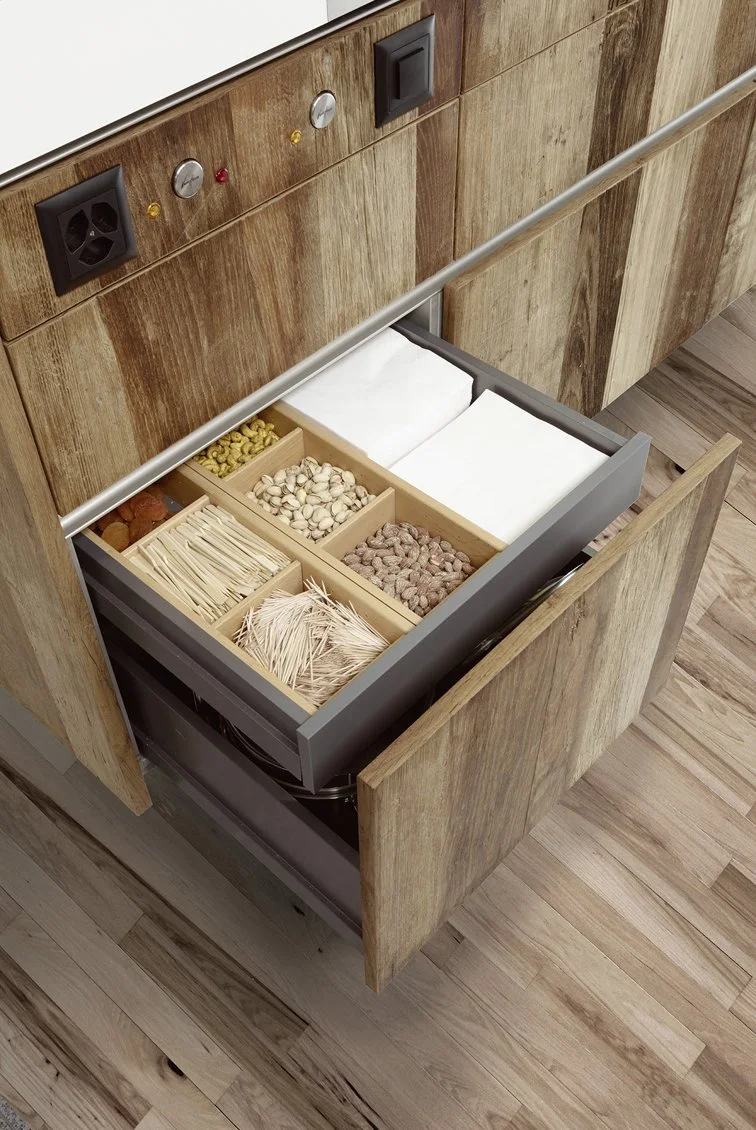 Car la véritable beauté d’une cuisine se cache dans son intérieur et dans les détails. PLUS contient tous les éléments qui, même invisibles dans un premier temps, n’en sont pas moins indispensables pour un résultat final parfait. L’ouverture des armoires suspendues est facilitée par les volets roulants et des charnières à fermeture lente permettent de fermer les portes en douceur; les tiroirs et les éléments coulissants ont été testés pour une charge maximale. La gamme propose un choix de différentes tailles et un large éventail d’accessoires pour tiroirs en différents matériaux est disponible pour les monoblocs. Cette cuisine moderne est tout simplement unique: cuisiner et faire la vaisselle sont un jeu d’enfant, tous les appareils sont parfaitement intégrés et on dispose d’une infinité de possibilités pour aménager cet espace à son goût.