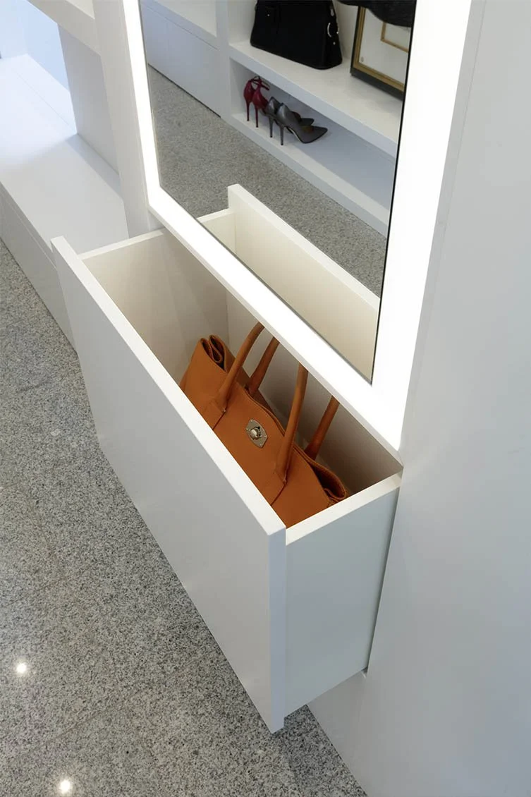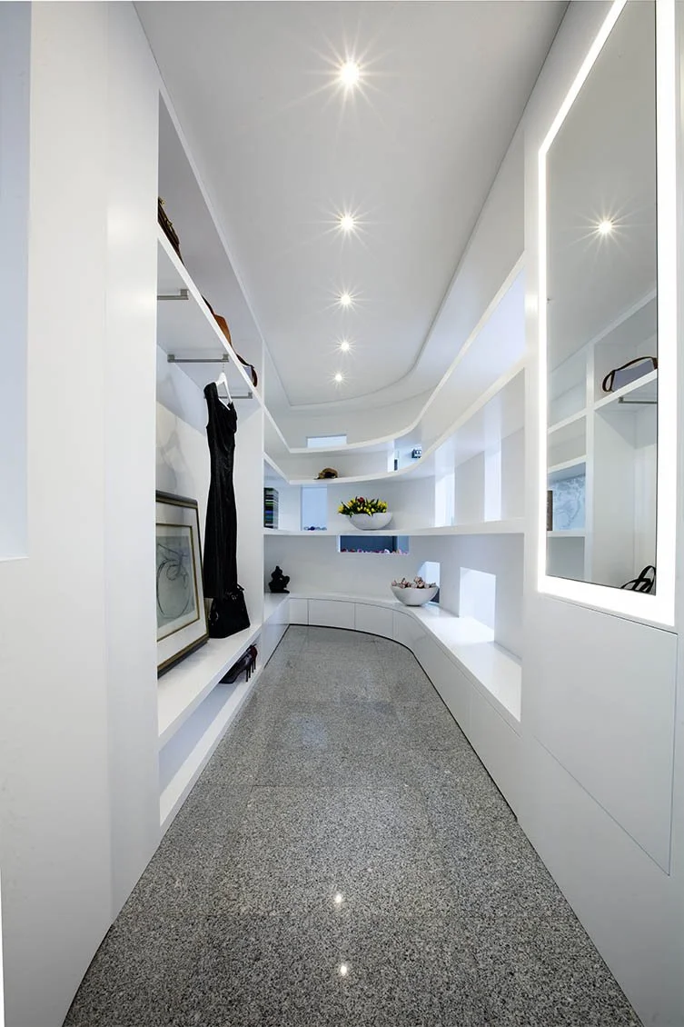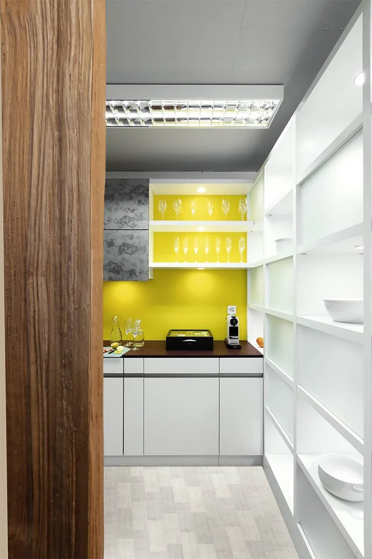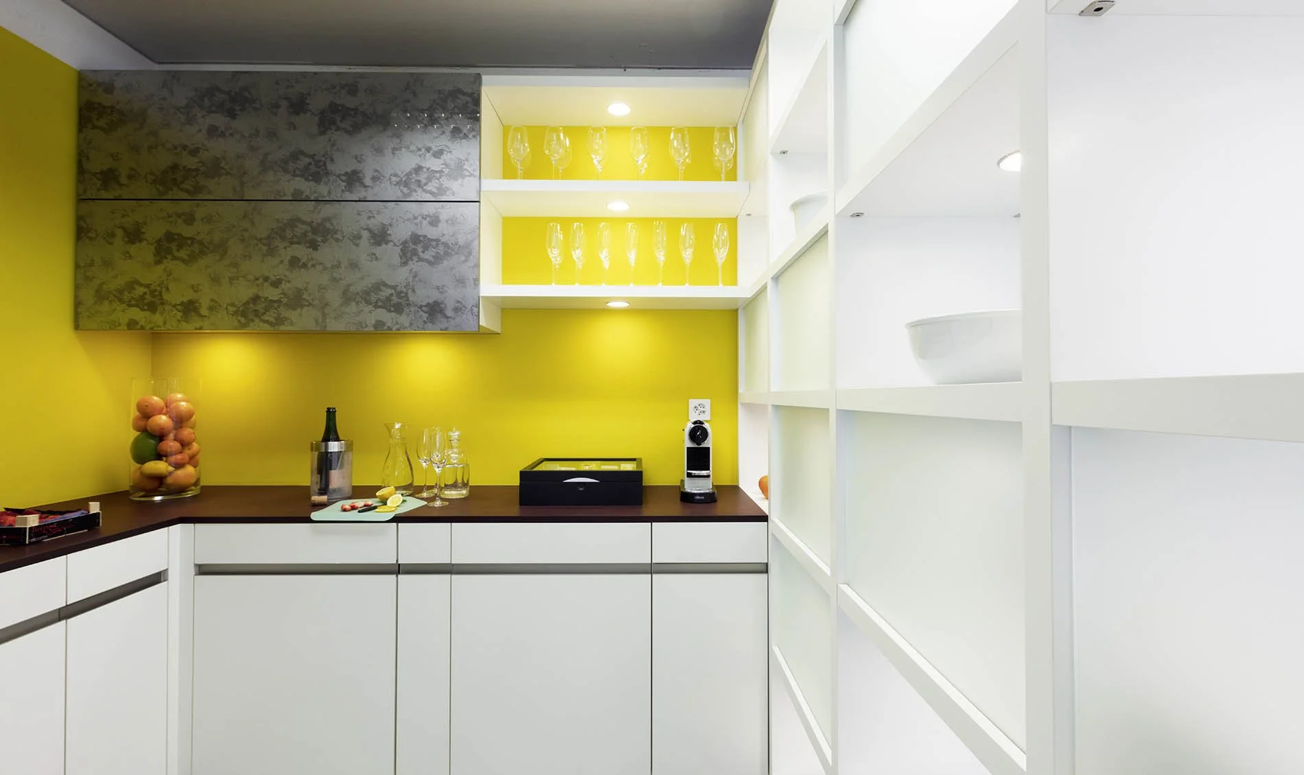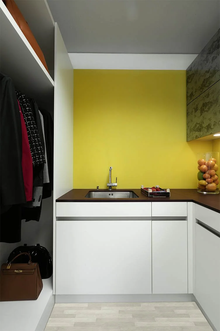 Pourquoi un studio, un petit appartement, un loft ou même un bureau ne pourraient-ils pas être conçus avec autant de confort qu’une grande maison? Le secret réside dans l’utilisation optimale de l’espace habitable avec intégration de meubles spécialement conçus et créés en fonction des besoins spécifiques. Podium Industries fabrique du mobilier et des aménagements de cuisine qui maximisent l’espace disponible afin de rendre le même environnement utilisable pour de multiples usages selon l’heure de la journée. Le vestiaire dissimule la mini-cuisine surmesure destinée à l’équipe du bureau ou pour proposer aux visiteurs un verre d’eau ou de jus de fruit à l’accueil. Mais on peut aussi y intégrer un équipement complet avec zone évier, lave-vaisselle et réfrigérateur ainsi qu’un élément haut pour ranger la vaisselle et les verres derrière la façade ascenseur.