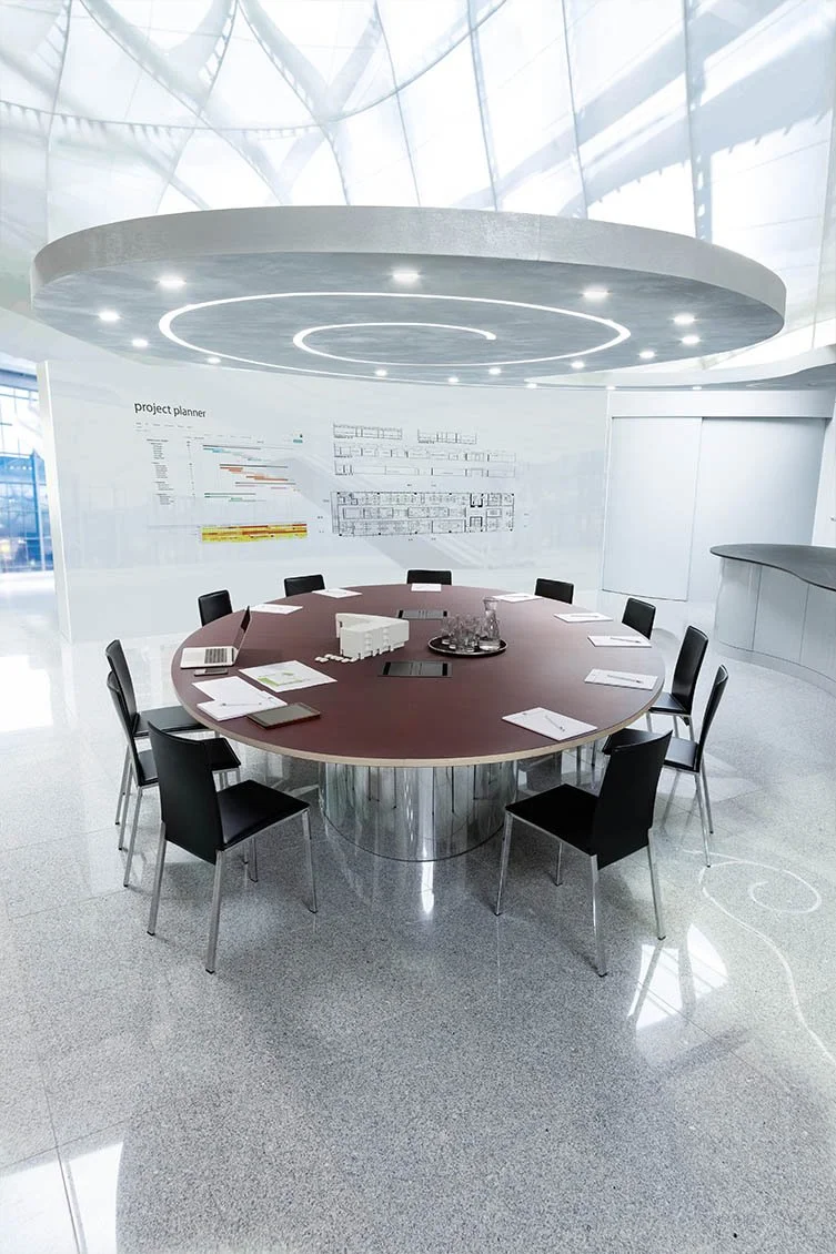 La salle de réunion doit être accueillante et favoriser l’échange d’idées et de conceptions. Toute la pièce contribue à créer l’atmosphère appropriée. Cette table ovale convient parfaitement pour une pièce carrée. La conception de la salle de réunion est extrêmement importante car elle en dit long sur notre façon de travailler et notre environnement.