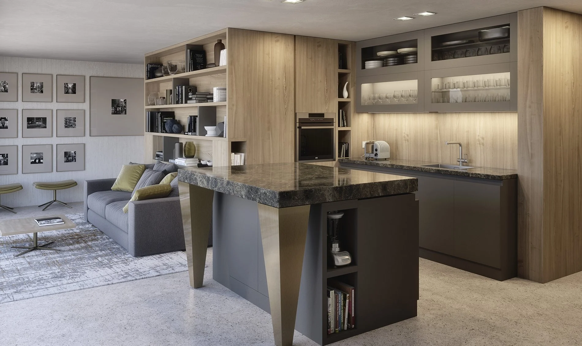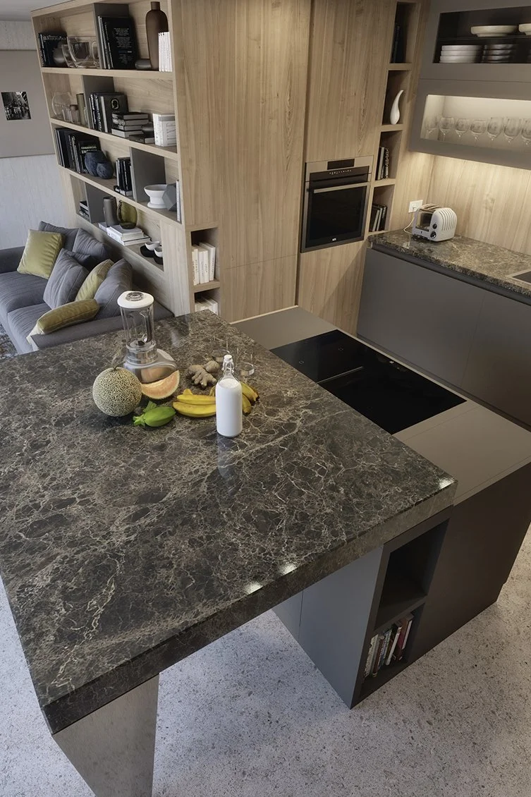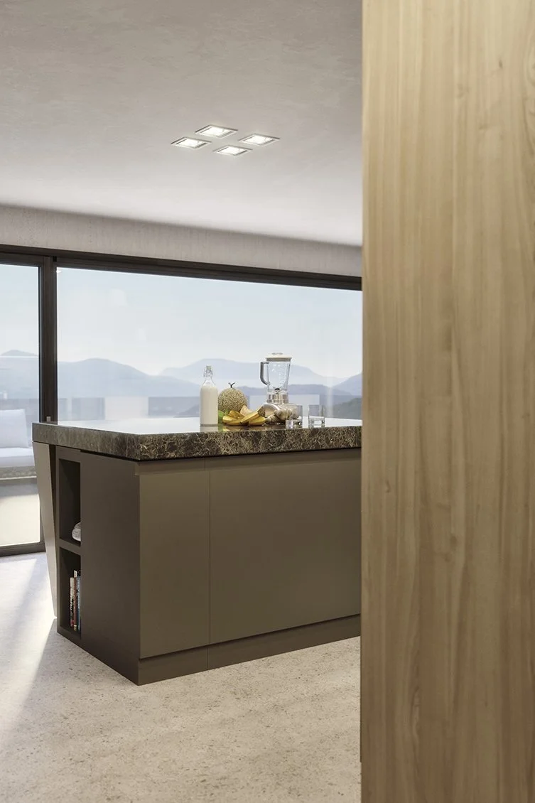 Un aménagement bien conçu permet d’obtenir plus avec moins. Le concept d’habitat est surprenant: un espace jour et nuit à la fois commun et séparé avec une grande cuisine ouverte et une cloison composée de meubles de rangement qui permettent de séparer les zones fonctionnelles.