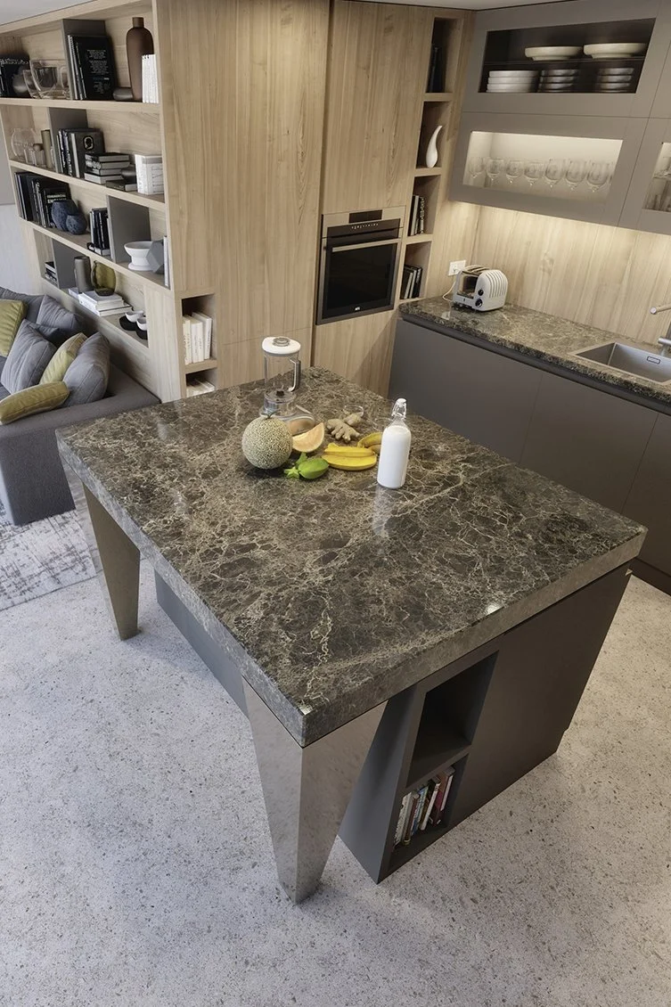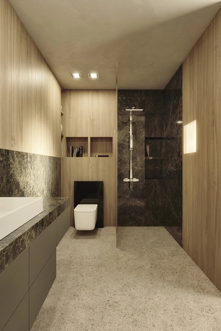 Dans l’espace salle de bains, l’esthétique est reine. Bien qu’une seule pièce soit à disposition, la salle de bains et les toilettes ont pu être installées, le mur du fond du lit servant de séparation. Dans la salle de bains, le mur est habillé de bois de placage et de marbre véritable. Cette harmonie des matériaux se retrouve dans tout l’appartement.