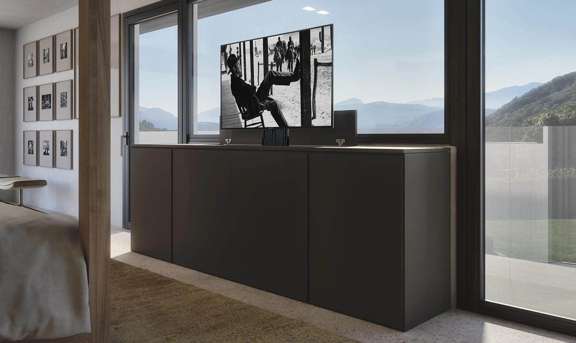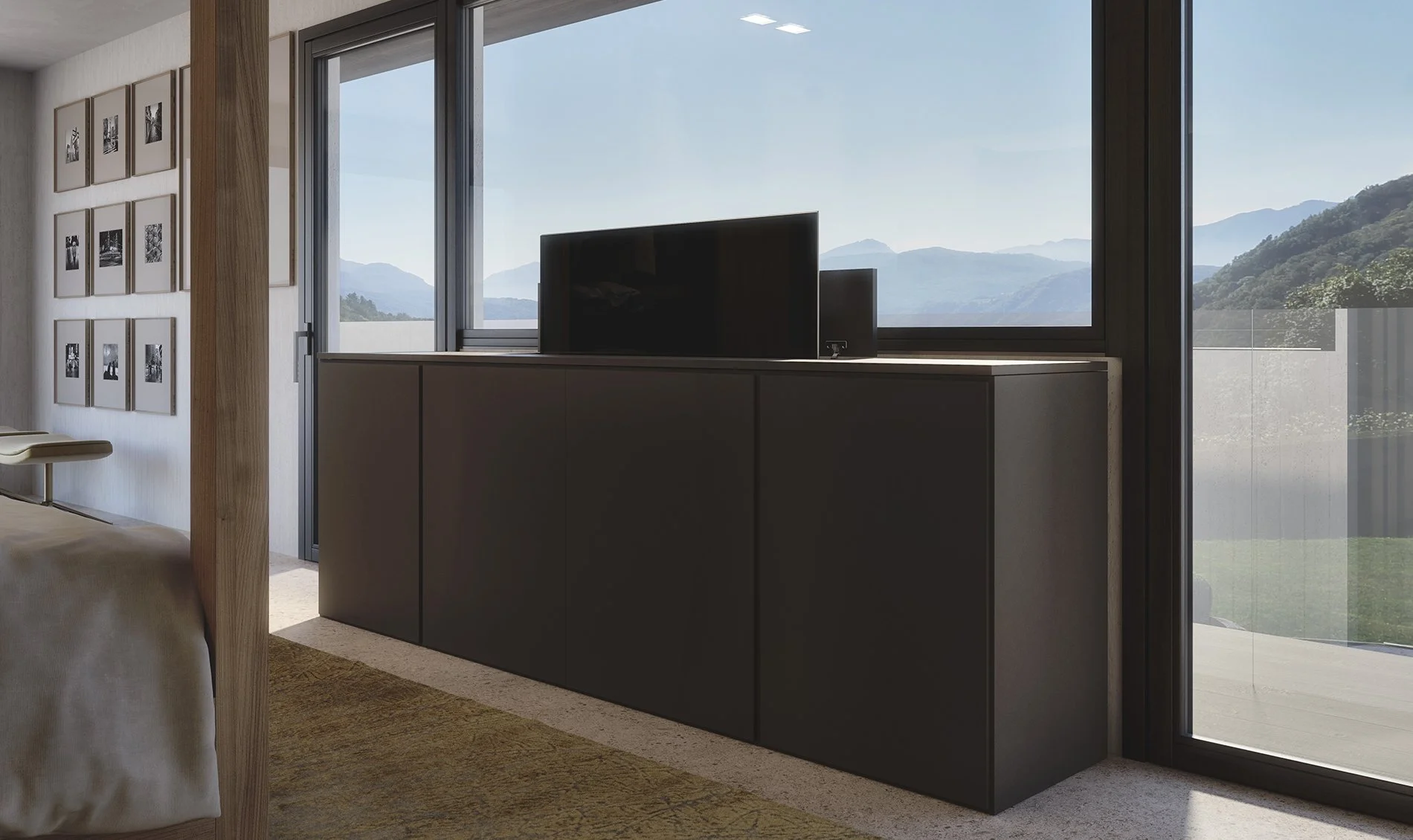 Le chêne naturel crée une ambiance chaleureuse dans l’espace nuit où le lit à baldaquin est la pièce maîtresse. Au bout de la pièce, l’espace multimédia est intégré dans un buffet. On trouve à côté un espace de rangement pour le linge ou autres. Le téléviseur peut être rentré ou sorti à l’aide d’une télécommande.