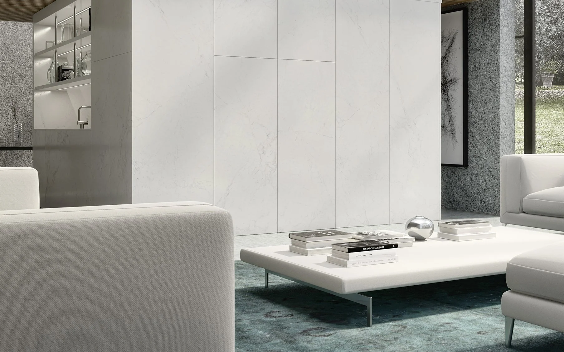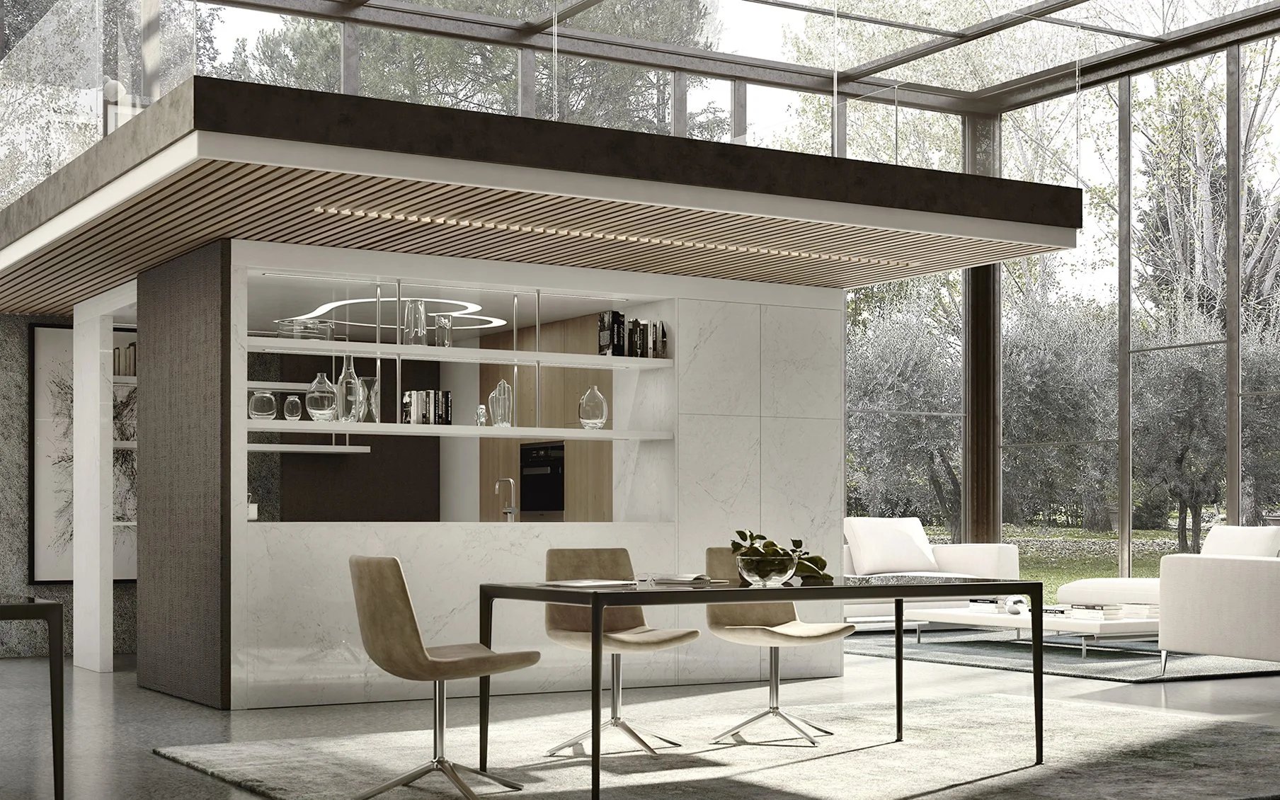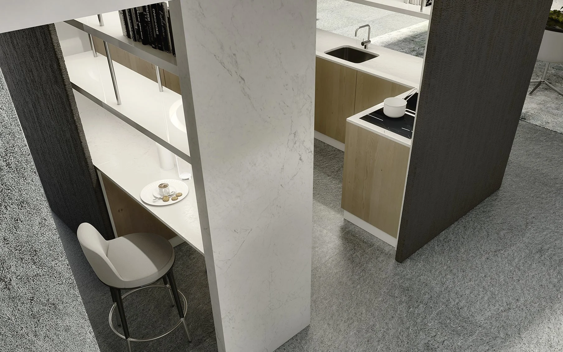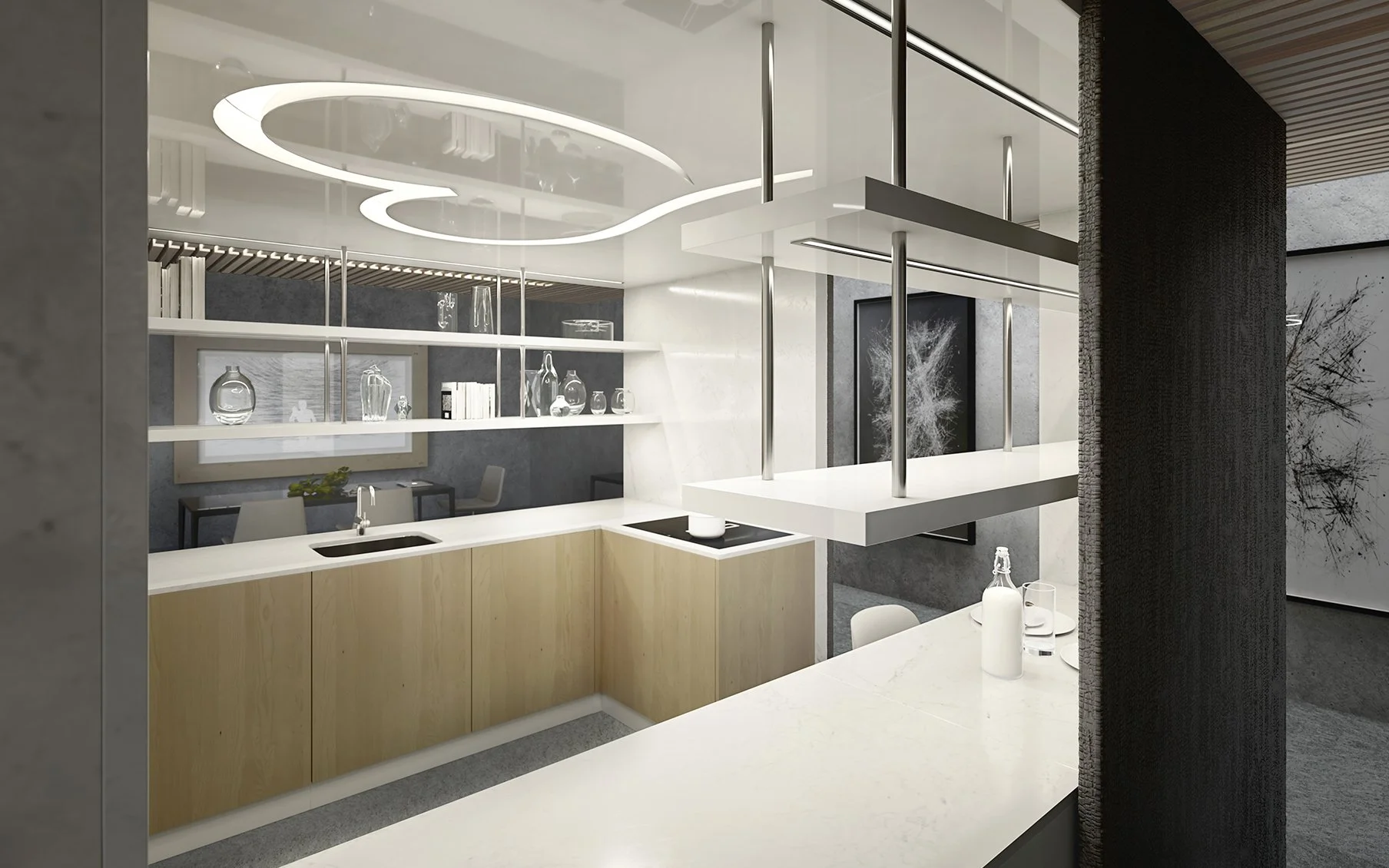L’intérieur est ennobli par un placage de bois en érable clair. Les étagères montées sur des supports en acier laqués en blanc apportent une touche lumineuse tandis que la partie externe est mise en valeur par une céramique façon marbre. «Essential Living» est planifié et réalisé en conformité exacte avec la vision et les idées du propriétaire ou de l’architecte d’intérieur.