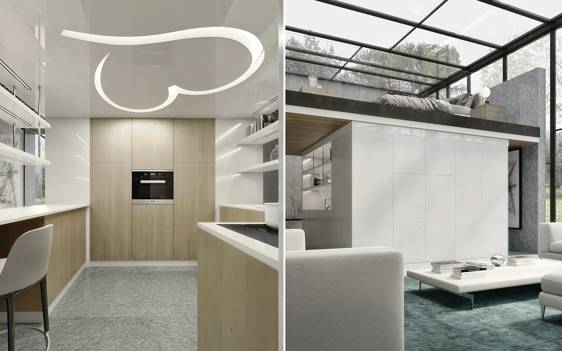 La cuisine se trouve au centre de la pièce avec toutes ses fonctions et la table de petit déjeuner ou de travail est ouverte. Elle est accessible par deux portes coulissantes. À l’intérieur, le cube contient des appareils de cuisine intelligents, plaçant la zone de travail au centre de la cuisine. Deux grandes portes coulissantes ferment l’espace. Elles laissent la vue dégagée sur le séjour et des étagères visibles sont fixées sur deux côtés pour ranger ustensiles de cuisine ou livres. L’aspect de l’ensemble de la pièce change en fonction du degré d’ouverture ou de fermeture des portes.